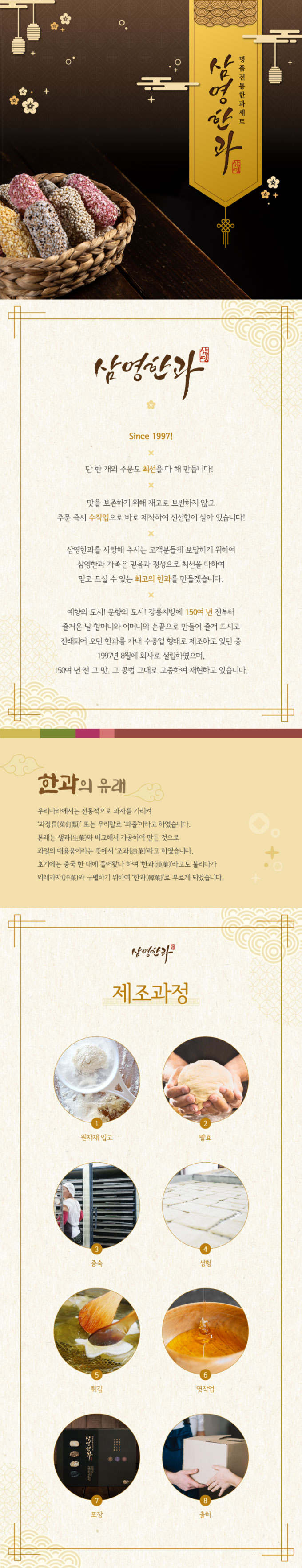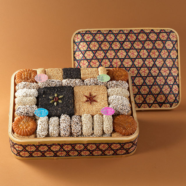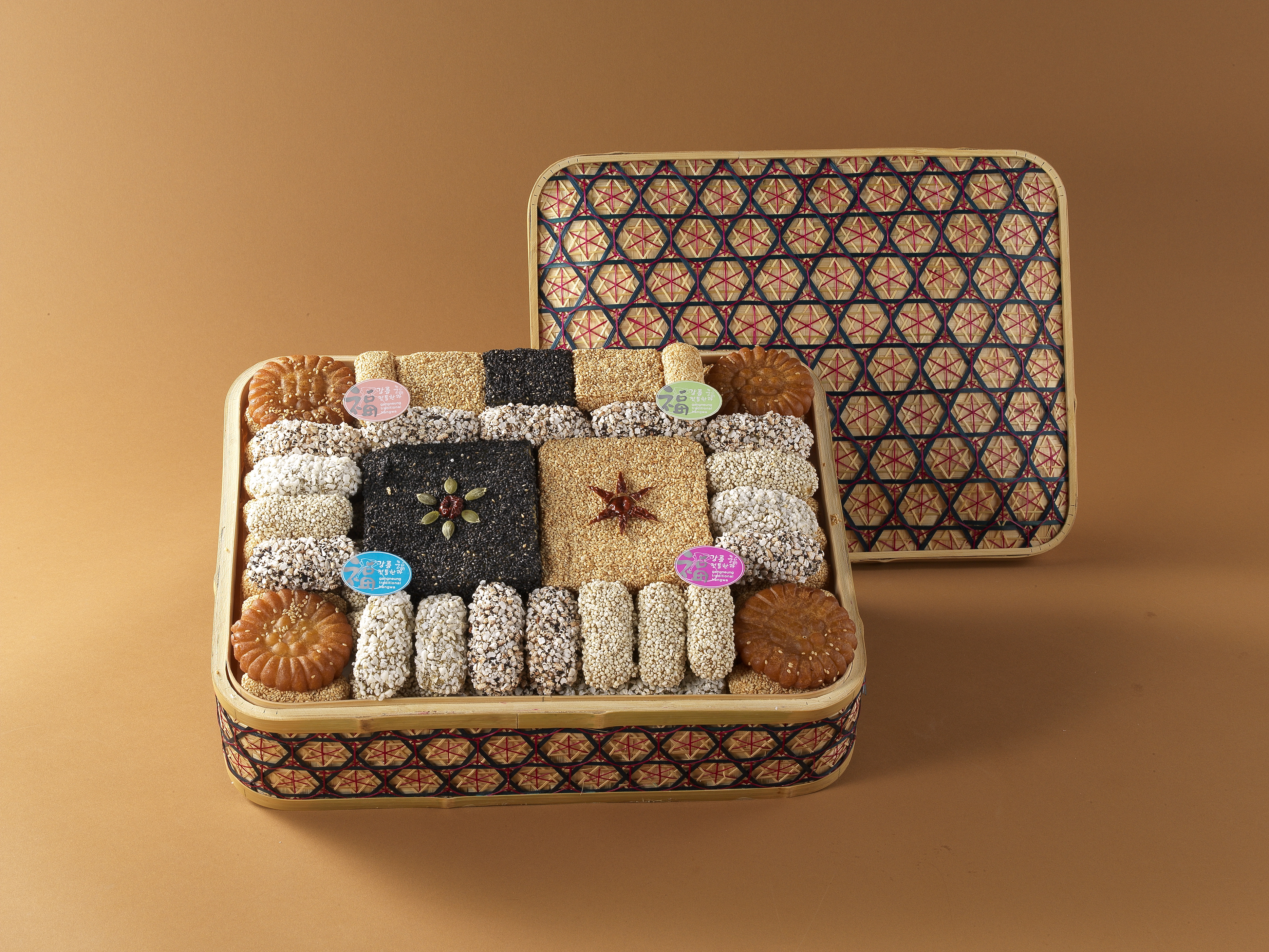 총4단구성. 1단 과즐(참깨, 흑깨, 찹쌀), 찹쌀약과 1~4단 강정 (참깨,흑임자,차조,흑미,쑥,찹쌀,백년초분,호박분) |